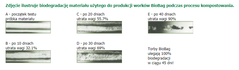 Worki BIOBAG rozkładają się w warunkach kompostowych (w obecności tlenu i mikroorganizmów) w około 45 dni. Nie pozostawiają po sobie toksyn, mikroplastiku ani śladu w glebie i wodzie. Dzięki temu wspierają naturalny obieg materii i redukują efekt cieplarniany.