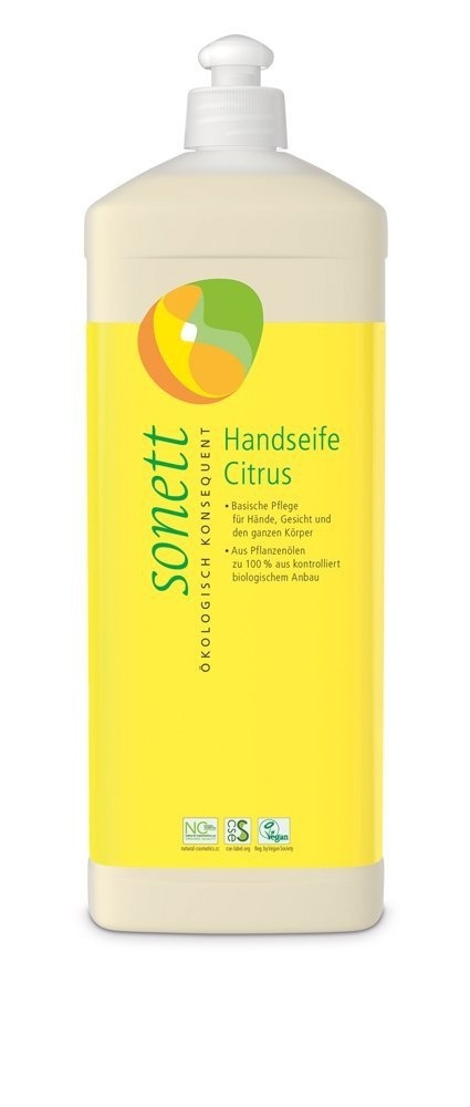 SONETT Mydło w płynie Cytrus 1L – świeże, naturalne i ekologiczne mydło roślinne do mycia rąk, twarzy i całego ciała. Zawiera olejki eteryczne z pomarańczy i cytryny. Idealne do codziennego użytku.