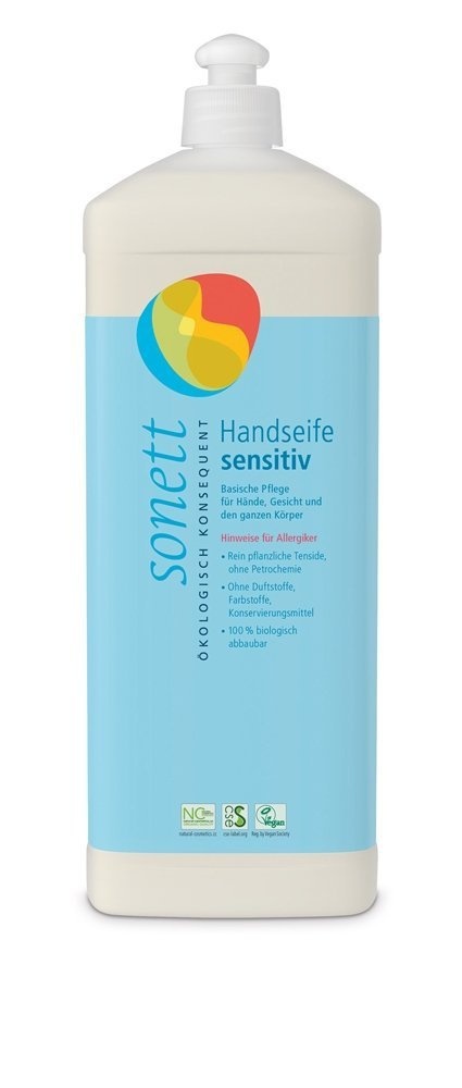 SONETT Mydło w płynie SENSITIV 1L – bezzapachowe, hipoalergiczne mydło dla skóry wrażliwej i alergicznej. Naturalna formuła bez olejków eterycznych i konserwantów. Idealne do rąk, twarzy i całego ciała.